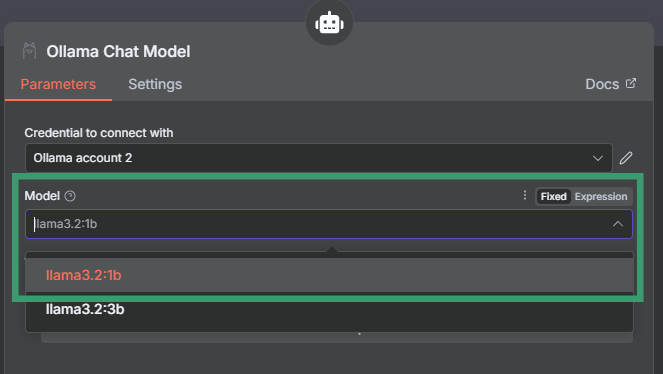 - In the Ollama Chat Model node, set Model to