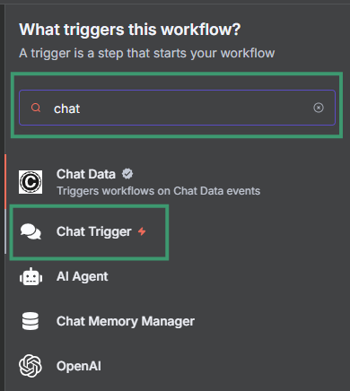 - Search for "Chat Trigger" in the nodes panel