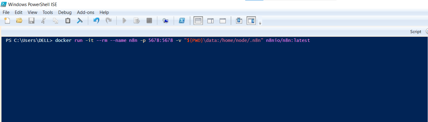 docker run -it --rm --name n8n -p 5678:5678 -v "${PWD}\data:/home/node/.n8n" n8nio/n8n:latest